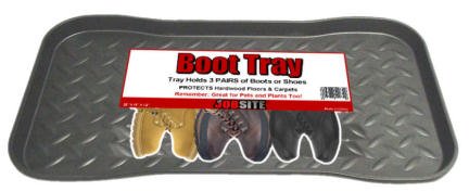Ideal for farm, ranch, home, cottage. Perfect for storing gardening or even pet supplies too. Plenty big enough to hold 3 pair of boots or shoes. Heavy gauge molded plastic with reinforcement for good support. Raised ribs on base to elevate boots above wet areas so they can dry off. Raised side walls to hold in melted ice, water and debris from leaking onto floor. Sturdy, yet portable and lightweight for any location.